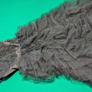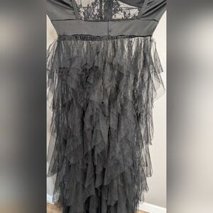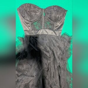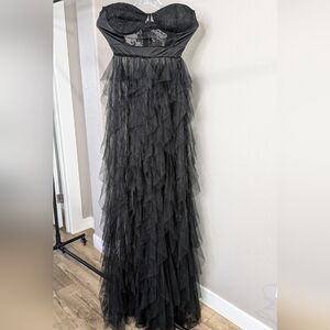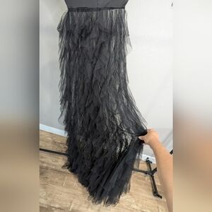 Stunning black strapless gown featuring a sheer overlay. Perfect for formal occasions.