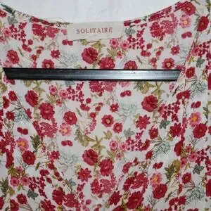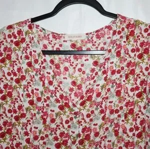Anthropologie Solitaire Red Floral Peasant Blouse. It is a lightweight top featuring a ditsy red floral pattern with green, white, pink, and yellow accents.