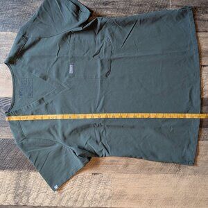 This is a Figs matching scrubs set in the core color Moss green. It is in excellent pre-owned condition, but the care tag has been cut off in the pants. It is a size medium, and the last five images show measurements. Slim fit, ribbed ankle cuffs, comfortable yoga waistband with adjustable drawcord. The pants have six pockets in total, with one side cargo zippered pocket, one interior security pocket, two deep trouser pockets, two back patch pockets. Soft FIONx fabric with four-way stretch, moisture-wicking, anti-wrinkle, and Silvadur antimicrobial technology for odor protection and durability.