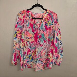 Lilly Pulitzer Pink and Blue 100% Silk Floral Blouse