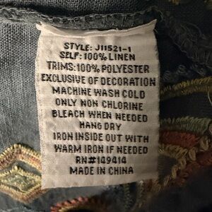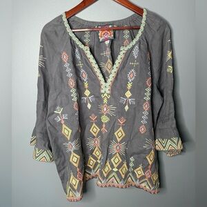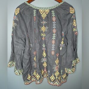Beautiful boho-chic blouse by Johnny Was featuring intricate multicolor embroidery on a rich cerise blue linen fabric. This lightweight peasant top has a relaxed, flowy silhouette with a split V-neckline and flared 3/4 bell sleeves. The detailed geometric embroidery along the front, sleeves, and hem gives it that signature Johnny Was artisan look.