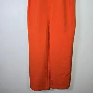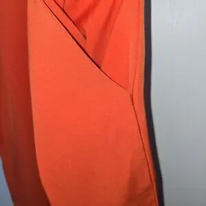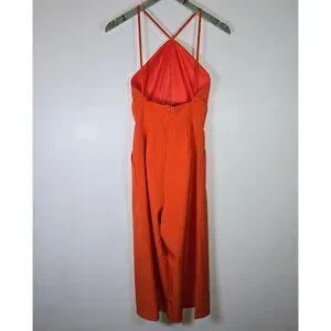 Vibrant orange halter jumpsuit. Features a keyhole neckline. Perfect for a bold statement look.