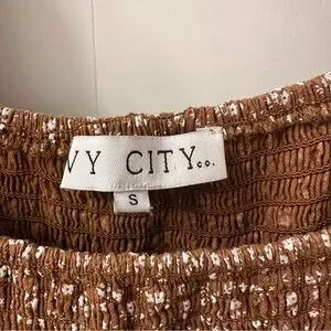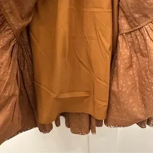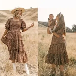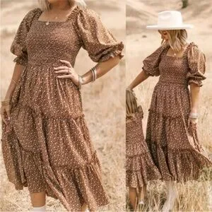 Brown colored dress with floral print, featuring a smocked bodice and tiered midi skirt