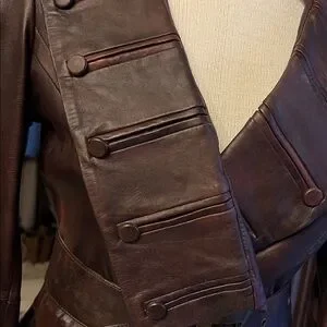 Stylish brown leather jacket for women, perfect for a chic and edgy look. Designed by LAMB by Gwen Steffanie. Distressed leather, military lapel details, fitted silhouette Exceptional details and quality, one of a kind!