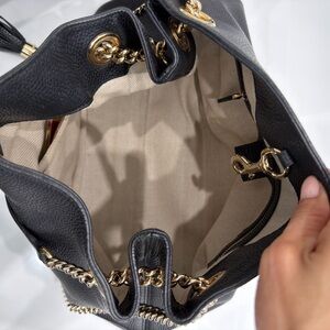 Chic black leather shoulder bag with iconic Gucci logo. Features elegant gold chain and tassel detail. Includes matching wallet.