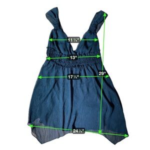 Turn heads with this vintage Jordache Y2K babydoll tunic top, a true throwback style. Features a deep V-neckline, wide ruched straps, smocked empire waist, and flowy sheer overlay with subtle metallic threading for a touch of shimmer.