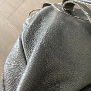 Vintage Roots leather backpack black preowned thick leather durable carry bag classic Canadian Roots backpack retro leather rucksack embossed logo heritage design vintage Roots bag collectible everyday carry backpack side zipper detail two front pockets functional storage preowned good condition timeless leather backpack unisex streetwear travel bag vintage Roots accessory rugged minimalist style