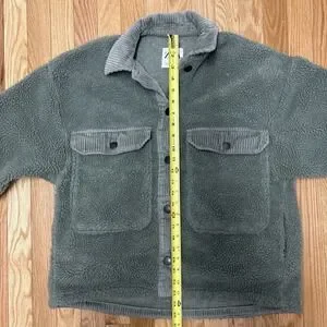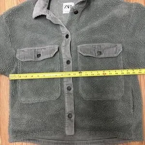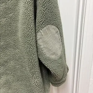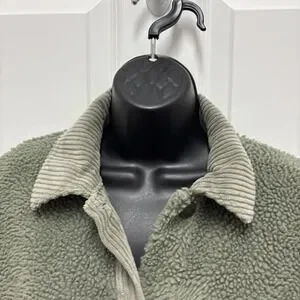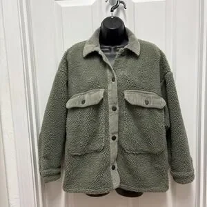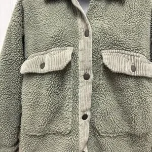 The Zara Green Sherpa Faux Fur Fleece Jacket in size Medium is a stylish and cozy outerwear piece perfect for the colder seasons. Made from polyester with a soft fleece lining, this short jacket features corduroy details and a button closure for a fashionable look. With a relaxed fit and long sleeves, it is ideal for casual travel or everyday wear, providing both warmth and comfort. The green color and indie theme make it a versatile addition to any winter, fall, or spring wardrobe, featuring convenient pockets for added functionality.