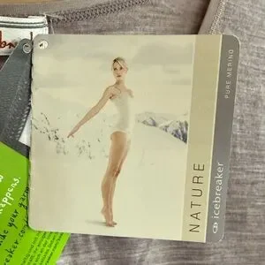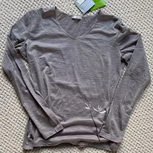 New with tags. Merino wool silk weight. Tapered body for flattering fit. Elegant heather gray top with floral detail. Subtle v-neck. Soft and comfortable. Perfect for everyday wear or your hiking, biking, touring outing.