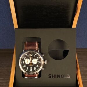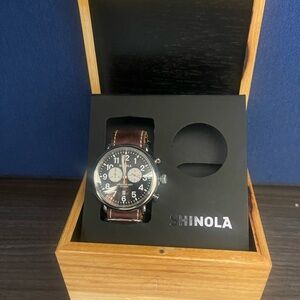 Stylish Shinola watch with a black dial. Features a brown leather strap. Ideal for any occasion.