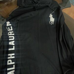Stylish black hoodie. Features iconic white Ralph Lauren logo. Comfortable and versatile.