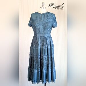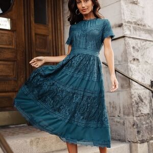 Discover elegance with the teal lace midi dress, perfect for tea parties and garden parties. The intricate lace detailing adds a sophisticated touch. Most of the dress is lined.