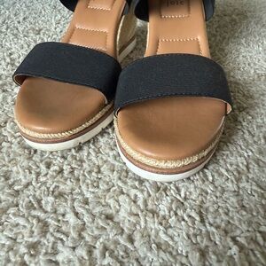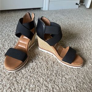 Elevate your style with these chic black wedge sandals. Perfect for any occasion, these shoes offer both comfort and elegance.
