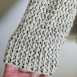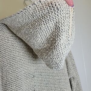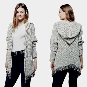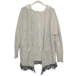 Cozy knit cardigan with hood. Features fringe hem. Perfect for layering.