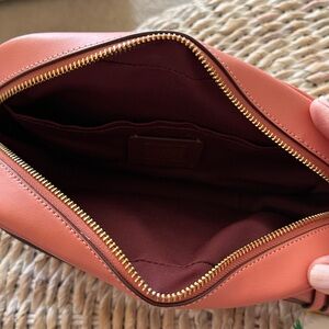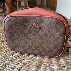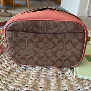Elegant Coach crossbody with signature pattern. Features brown and coral tones. Ideal for versatile styling.