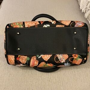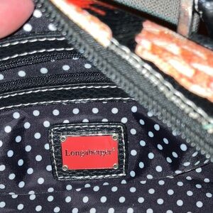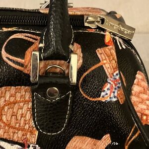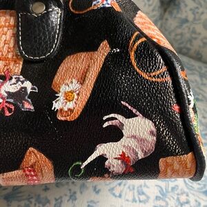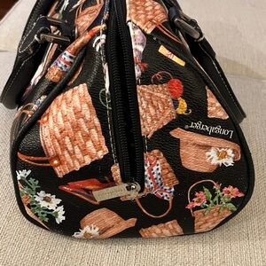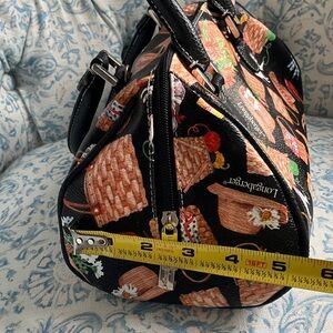Super cute purse from Longaberger baskets. It is made of man-made materials. There is a print all over the bag, which includes lots of baskets, some straw hats, dogs and cats and even a pair of red shoes. The background color is black and the hardware is gold. This purse has handles, but also has a removable shoulder strap. It has a couple of scuffs as shown in the last photo.