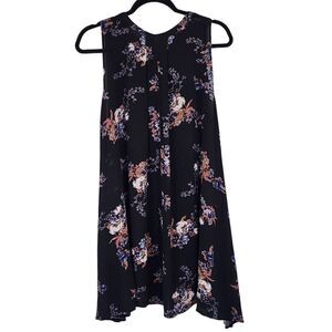 Free People black floral print sleeveless swing mini dress single front button with cutout & pockets in great condition 28" pit-pit 30-34" long
