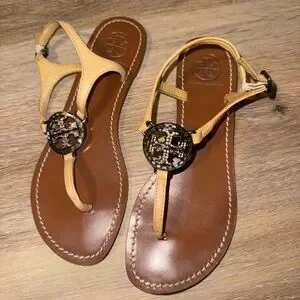 Elegant Tory Burch sandals with signature logo. Brown sole with tan straps. Ideal for casual wear.