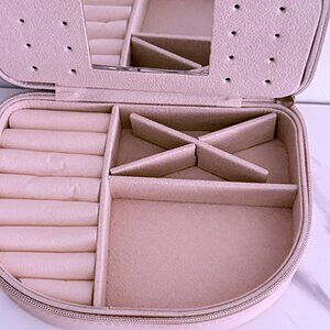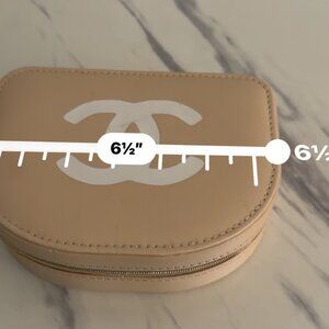 CHANEL LITTLE JEWELRY CASE FOR CRUISES, TRIPS, ANY VACATIONS! IT'S THE PERFECT SIZE! THE CONDITION is really good, except two of the rollers have a crease. I'm not sure how that came to be. See photos please. This is a must have for luxurious ladies who travel, esp flight attendants and laddies who travel for work. Pull that out of your suitcase and make everyone so jealous!! It's a beautiful color of Blush pinkish with the signature CC in white. I do not think this is Authentic, bc I only paid like $400 for it. It did come in a Chanel bag though. If you win the item, I will include a little gift with your purchase!