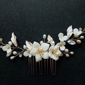 • Material: Faux pearls, clay flowers, crystal leaves, silver wire comb