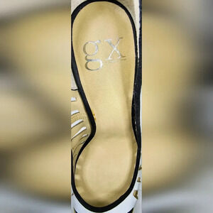 GX by Gwen Stefani Addie High Heel Black and White Pumps featuring Island platform, geometric cutouts, pointed toe, 5 inch heels, 9, in excellent pre-loved condition