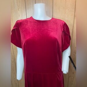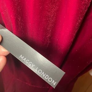 Elegant red asymmetrical dress by Maggy London. Features short sleeves and a unique hemline. Perfect for special occasions.
