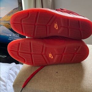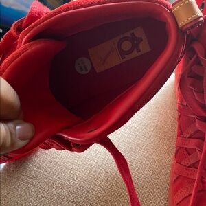 Stylish red high-top sneakers featuring a swoosh logo. Perfect for casual wear.