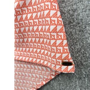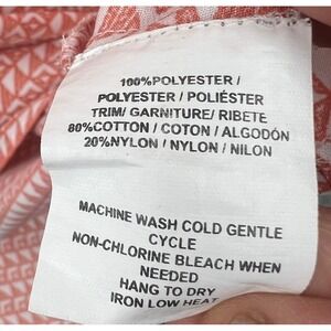 sun-washed coastal boho O'Neill coral geo tank dress with a soft scoop neckline, sleeveless cut, and an easy high-low hem that moves beautifully when worn, featuring an allover coral and white geometric print with a lightweight drapey feel and a standout white lace inset panel across the upper back for contrast and texture; designed in a relaxed fit that skims the body without clinging, finished with subtle pleating at the waist for flow and shape, made from breathable polyester with a cotton-nylon lace trim, perfect for beach days, summer travel, festivals, or casual layering with sandals or sneakers, in excellent pre-owned condition with no noted flaws.