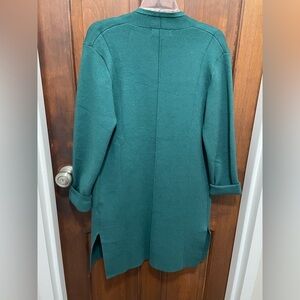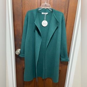 Stay cozy and stylish with this elegant green knit cardigan sweater. Perfect for layering and adding a pop of color to your outfit.open front, long sleeves, split both side. Color beautiful green. Jacket. New with tag . Size Large pit to pit 20” sleeve 24” length 36” shoulder to shoulder 16.5”