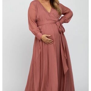 Chic long sleeve maternity dress in dusty rose. Features a wrap design with a tie waist. Soft and flowing fabric for comfort.