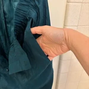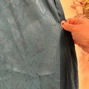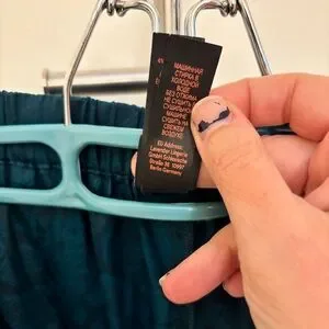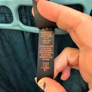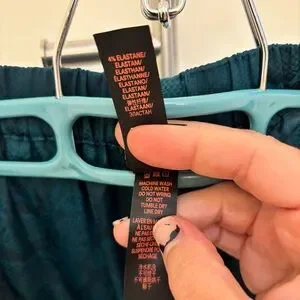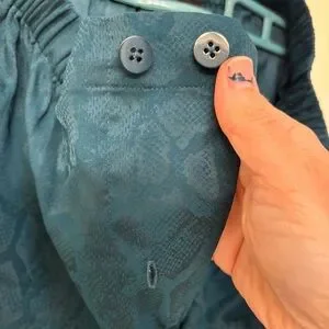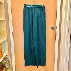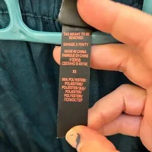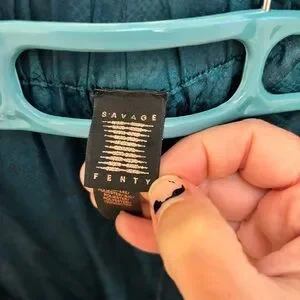 Hello, love! Slip into these satin polyester sleep pants. They have a little bit of a sheen to them with a snake print. Button fly with adjustable double button waist. Matches green demeanor on savage website. Slant pockets on either side. And a logo tag at the very base of the wide comfy leg. Chic teal pants with a unique pattern. Ideal for making a statement. Lingerie by Rihana. All questions and offers are welcome. Xox