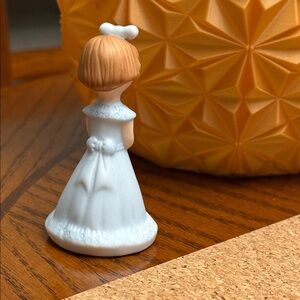 Charming porcelain figurine wearing a light blue dress. Features a delicate bow and floral details.