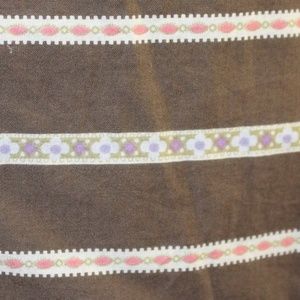 - brown color with dainty detailing at the bottom of the skirt lavender, pink and cream