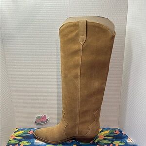Stylish tan suede knee-high boots. Perfect for any occasion.
