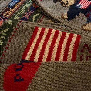 This wool cardigan is decorated with intarsia-knit motifs throughout, including Fair Isle–inspired patterns, the Polo Bear, and signature Ralph Lauren logos. The relaxed silhouette features an enveloping shawl collar and full-zip placket.