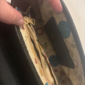This chic women's bag features a stylish black flap with floral accents and a woven tan body. Perfect for adding a touch of elegance to any outfit. This is used has some wear due to use and age some marks and little chips still super cute bag