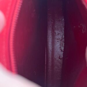 Good vintage condition. The exterior leather is vibrant, bright, and holds its structured shape beautifully, with only minor signs of wear (a few faint dark marks/scuffs on the base and corners).