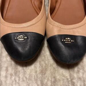 Chic Coach loafers with a sleek black toe and tan body. Ideal for any occasion. In used condition