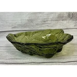 The Vintage Green Indiana Glass Loganberry & Leaf Pattern Candy Trinket Dish Bowl