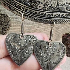 This stunning silver plated brass hand etched collar bib necklace with a floral motif and moth/ butterfly as a center and heart dangles. traditional to the Hills Tribes of Thailand, Laos and S. China Miao/Hmong cultures. a display of wealth and significant cultural meaning. unique hook clasp