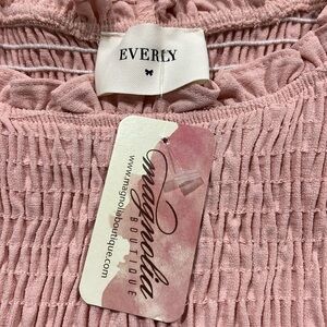 Adorable light pink dress from Everly featuring a smocked bodice, ruffled neckline, and long puff sleeves with elastic cuffs. Soft, flowy fabric—perfect for special occasions or everyday wear. Made in the USA