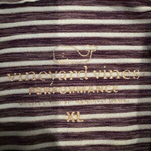 The product is a Vineyard Vines men's performance blue and gray striped polo shirt in size XL. It is made with Dri-Fit material to ensure breathability and moisture-wicking. This shirt is perfect for the active man looking for a stylish and functional polo option. The striped pattern adds a touch of style to the classic polo design, making it a versatile piece for any man's wardrobe.