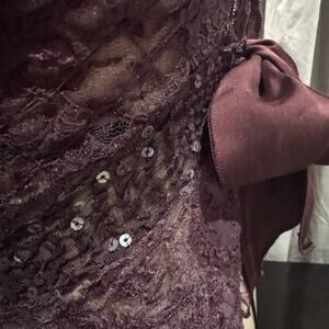 Stretch pucker cross dye lace trimmed with embroidered sequin pucker mesh , with a silk charmeuse tie, can be a plunge front top, or worn as a cardigan.