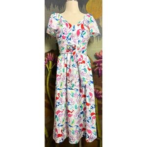 This fantastically whimsical dress by Tanya Taylor features a multicolor flamingo pattern on a crisp white background.