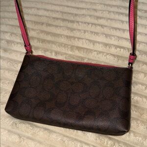 Stylish Coach crossbody with iconic pattern. Dark brown with striking red trim. Perfect for daily wear.