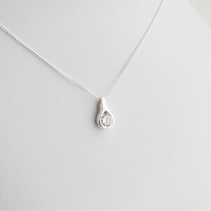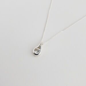 Sterling silver pendant necklace with clear round crystal teardrop pendant. Marked 925 and tested positive for sterling silver. Pendant is pre-owned in gently used condition such as light surface scratches, not noticeable and patina. Sterling silver curb chain is new. Please refer to photos.