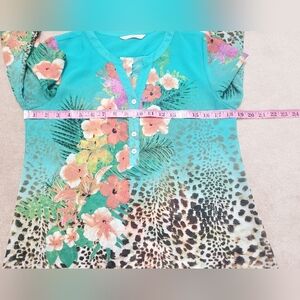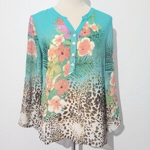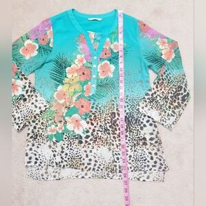 Soft Surroundings Tropical Floral Leopard Tunic Top Teal 3/4 Sleeve Size Medium