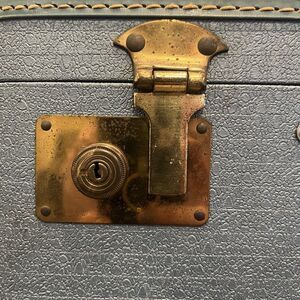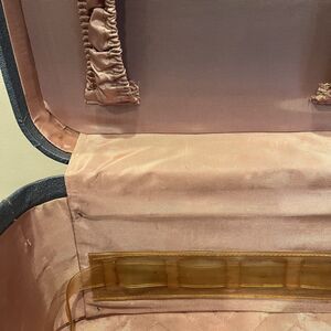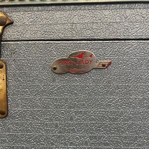 Rare First Lady branded train case from 1961. Featuring blush pink rayon/silk lining, gather elastic pocket in lid for storage or mirror, amber plastic strip in lower compartment. This does not come with key, but is unlocked. To open, simply pull the locks outside and the latches pop open. There are some scratches and blemished on the case, but overall in extremely great shape for its age. It has spent a large part of its life in storage, so there is a stale smell that comes with older items. First Lady jet plane ocean liner logo.