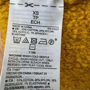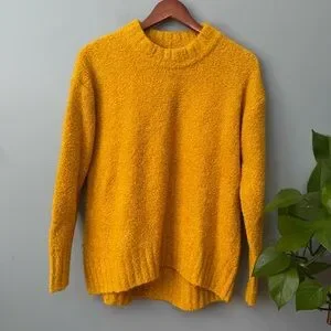 About Item: Rib-knit crew neck. Long drop-shoulder sleeves, with rib-knit cuffs. Hi-lo rib-knit hem. Cozy, soft-brushed bouclé cotton-blend yarn, with comfortable stretch. 53% cotton, 28% nylon, 18% acrylic, one percent spandex. Machine wash. Color is Gold (perfect fall color!). Slouchy, oversized fit through body. Women's sweater hits below waist. 1.2 lbs