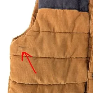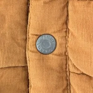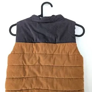 A Tommy Bahama corduroy puffer vest in warm caramel brown with contrasting charcoal yoke. Quilted, lightly padded for cozy layering, featuring snap-button front and utility flap pockets. Soft corduroy texture gives it a rugged yet elevated feel—perfect for fall hikes, casual weekends, or cabin vibes.